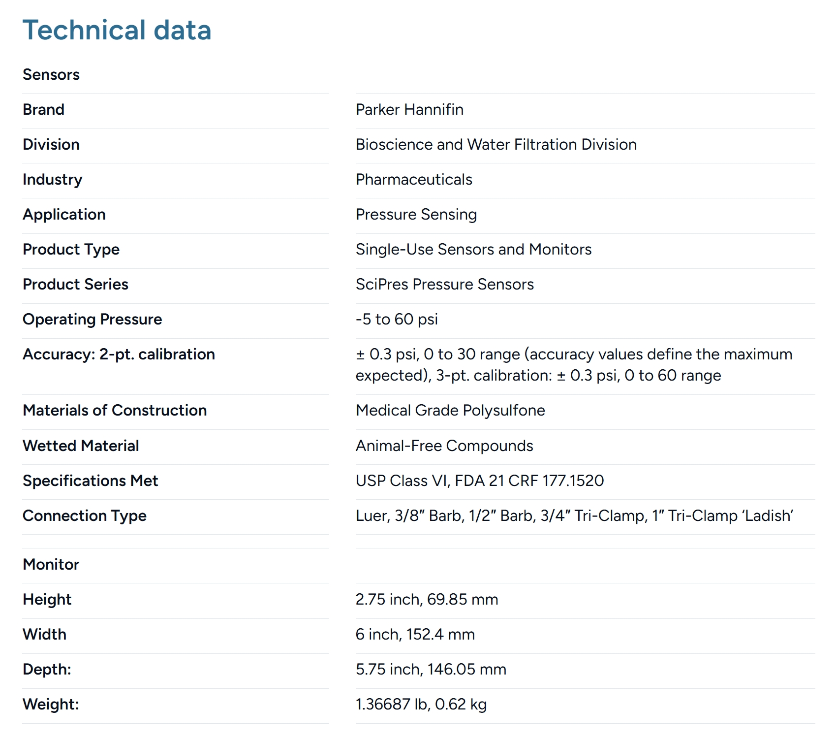 With five available sizes, SciPres® sensors support scalability from development to full production. By ensuring accurate monitoring of critical parameters such as transmembrane pressure and delta column pressure, they help optimise yields, protect system integrity, and maintain process consistency.