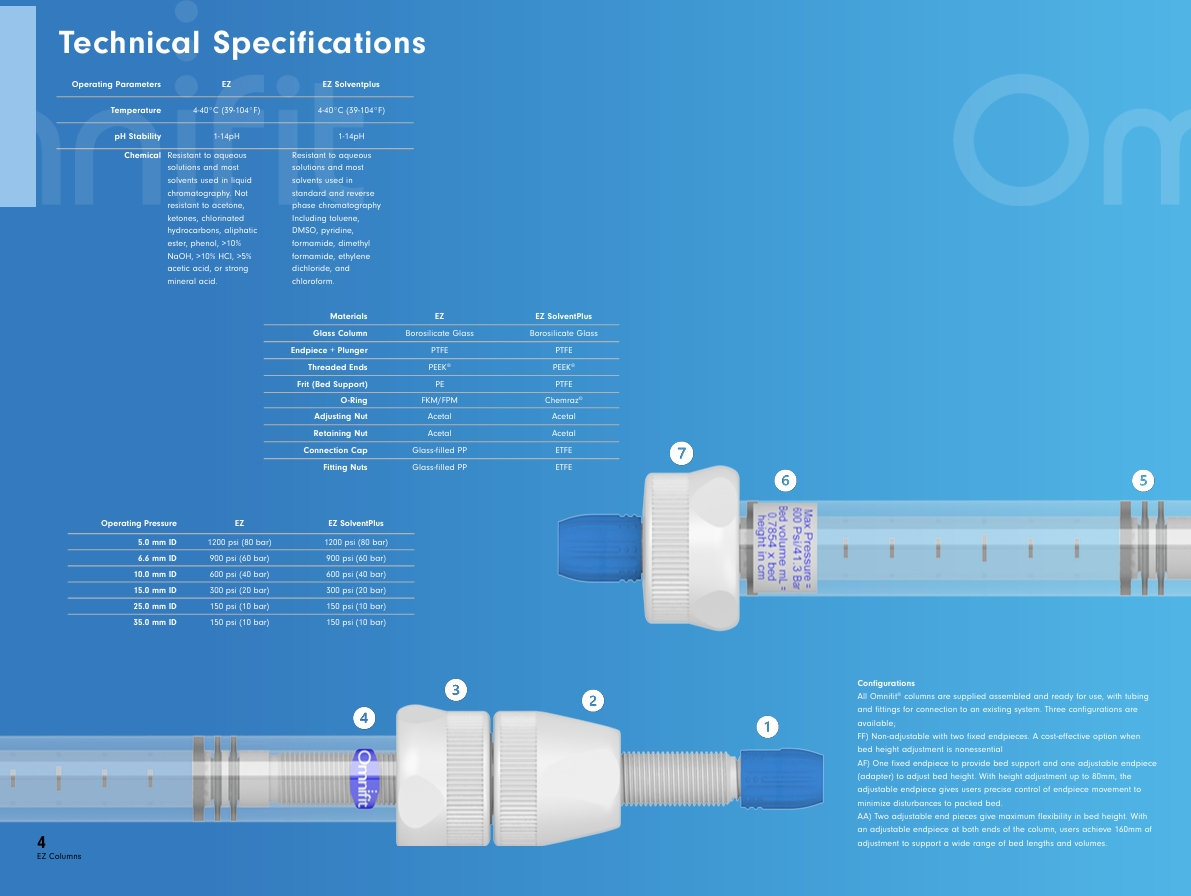 All Omnifit® EZ glass chromatography column components are available separately to provide complete flexibility for you to replace lost, damaged or worn parts. You can use Omnifit columns for many different applications with proper care and cleaning. This modular approach allows Omnifit® columns to have an extremely long life with maximum flexibility.